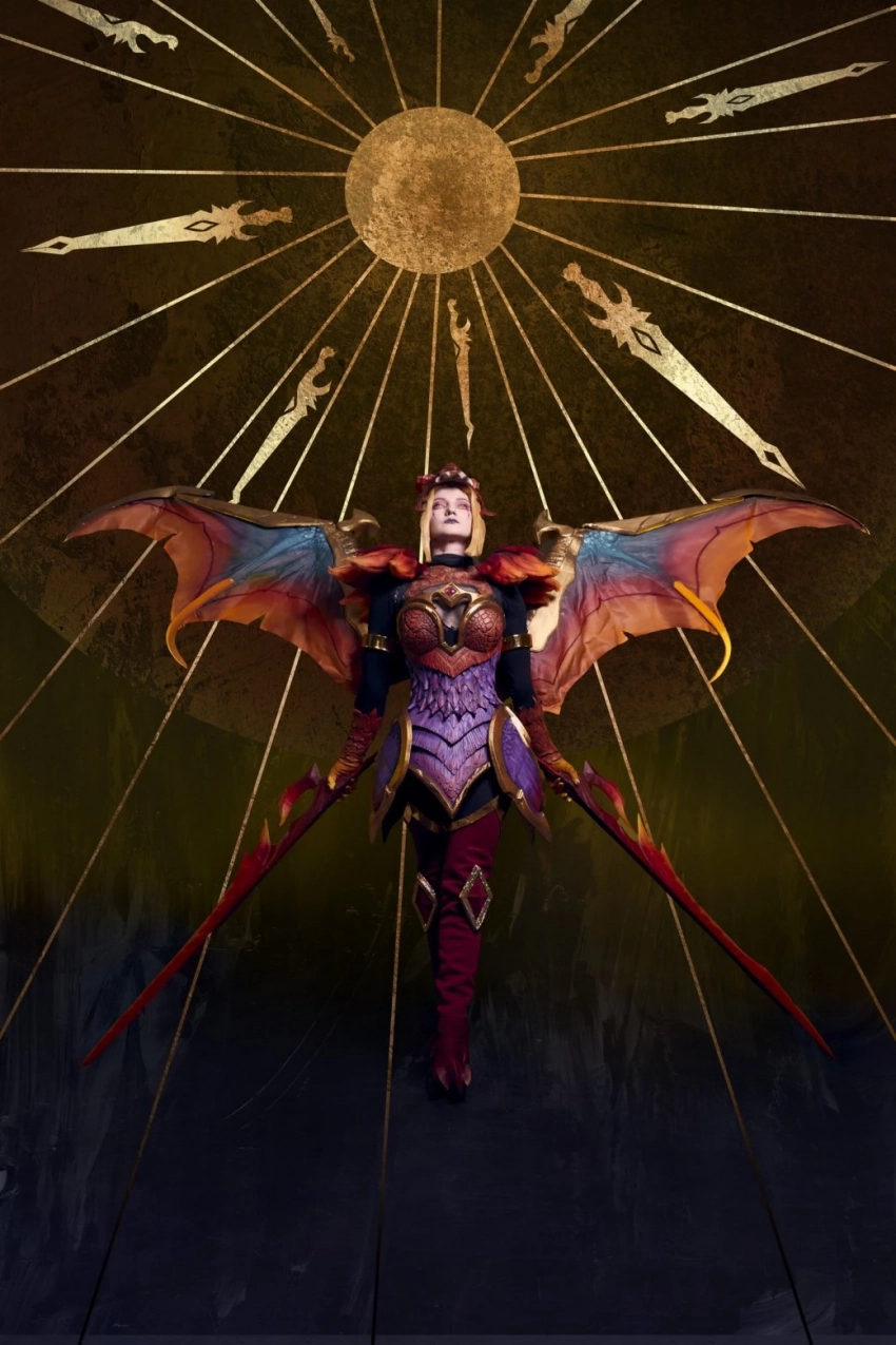 Модель же выбрала образ “убийцы драконов”. Вместо традиционных ангельских доспехов героиня облачается в тяжелую броню темных оттенков, украшенную элементами, напоминающими драконью чешую.