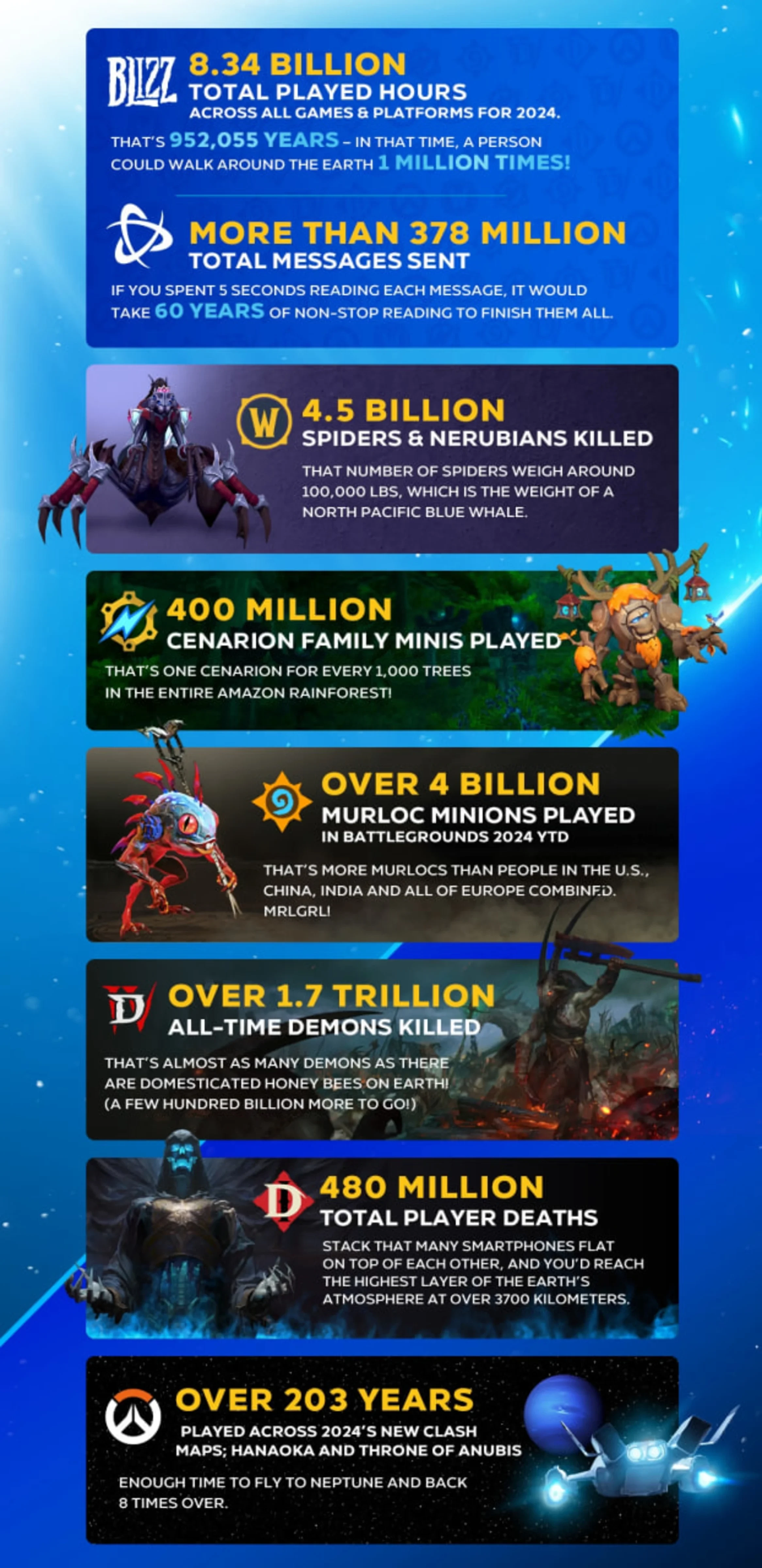 В 2024 году пользователи убили 4,5 млрд пауков и нерубианцев (раса арахнидов) в World of Warcraft, а в Diablo IV игроки уничтожили 1,7 триллионов демонов. К слову, за год в играх Diablo фанаты погибли 480 млн раз.