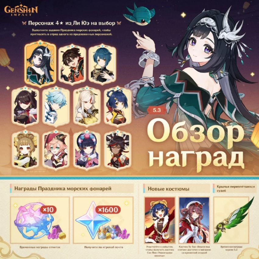 На выбор будут даваться и другие четырёхзвёздочные персонажи из региона Ли Юэ. Чтобы воспользоваться щедрым предложением, предстоит выполнить задания Праздника. К другим наградам относятся примогемы (выдаются в письмах), крутки за отметки, костюмы за участие в событиях и Крылья переплётшихся судеб — они станут временной наградой версии 5.3.