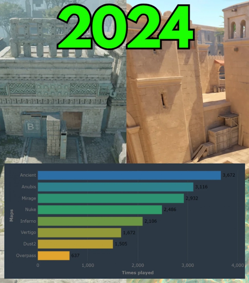 Самое интересное о кино на YouTube канале Игромании!В 2024 году карта Ancient заняла первое место среди всех карт на профессиональной сцене Counter-Strike 2, превзойдя по популярности даже как Anubis и Mirage. Согласно статистике HLTV, за год на карте Ancient сыграли 3672 матча, что значительно больше, чем на других картах.