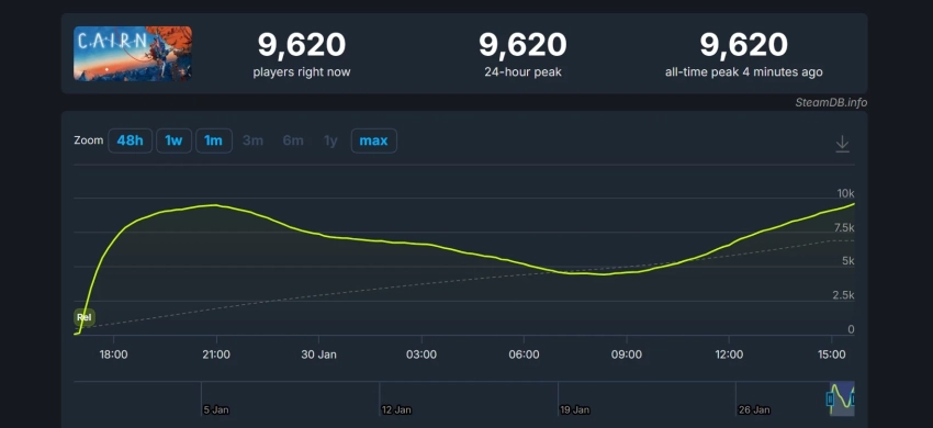 Тем временем Cairn успела обновить свой пиковый онлайн в Steam — он превысил 9,6 тыс. игроков. Вероятно, в ближайшие часы число увеличится. Особенно с учётом бесплатной рекламы со стороны авторов знаменитой Clair Obscur: Expedition 33.