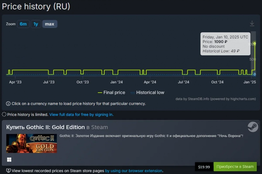 Цены на Gothic, Gothic 2 и Gothic 3 выросли до 1090 рублей, тогда как ранее они стоили 199 рублей без скидок. Дополнение Gothic 3: Forsaken Gods также подорожало, увеличившись с 199 до 610 рублей.