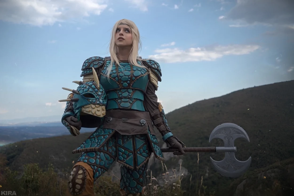 Модель показала беловолосую девушку, облаченную в доспехи, напоминающие броню ее дракона Громгильды, а в ее руках топор.
