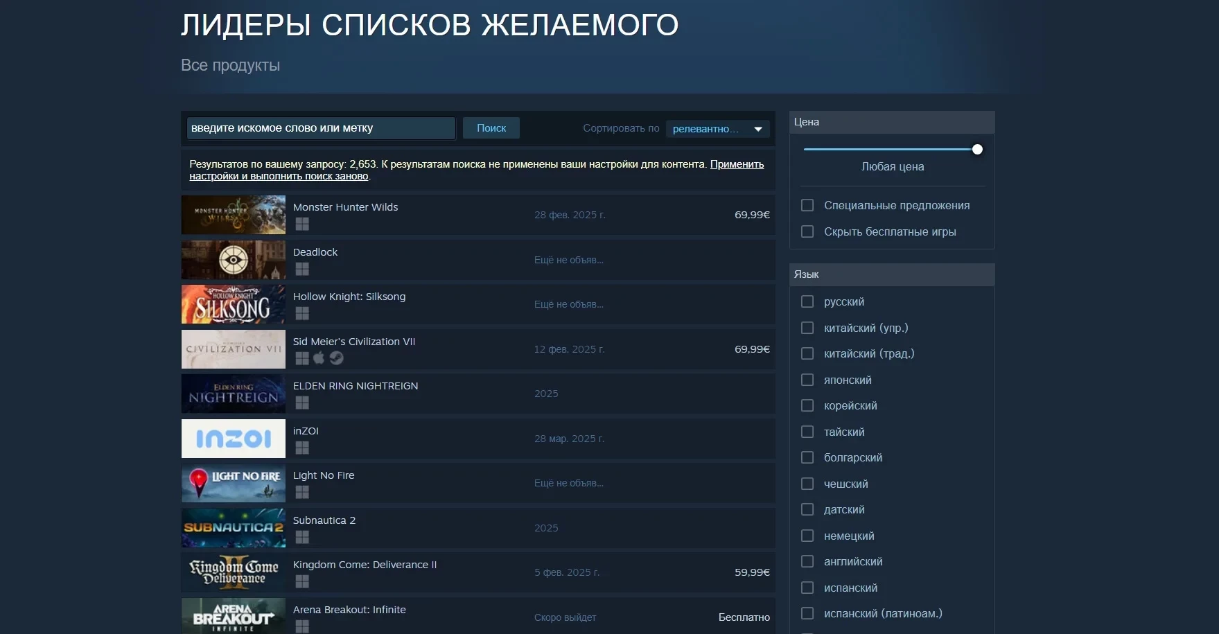 В главной десятке желаемого Steam также нашлись места для «убийцы The Sims» InZOI, который выходит 28 марта, и ролевой Kingdom Come: Deliverance 2, которая станет доступна для игры уже 5 февраля. Они заняли 6-ю и 9-ю позиции соответственно.