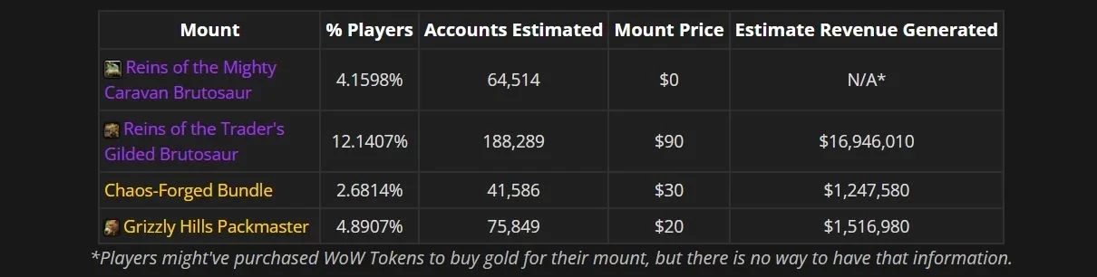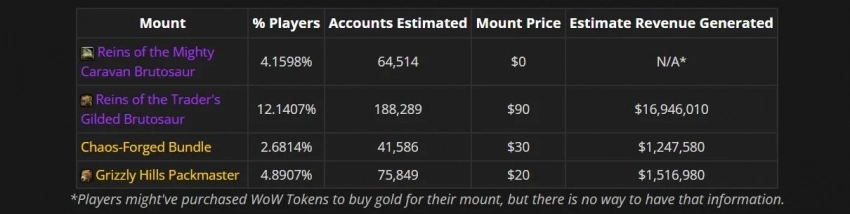 Сайт Wowhead попытался примерно подсчитать, сколько брутозавров было продано, пользуясь данными Data for Azeroth и Raider.io. Это весьма приблизительные прикидки, учитывая возможность покупки за внутриигровое золото, но Позолоченный брутозавр торговца, по подсчётам, имеется у 5,35% учётных записей. Это более полутора миллиона аккаунтов, что даёт 16,9 миллиона долларов прибыли для Blizzard.