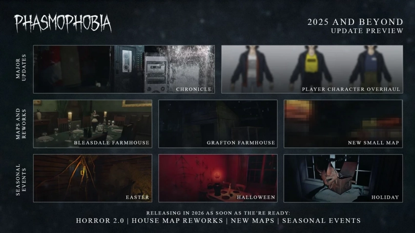 Также в 2025 году нас ждёт обновление персонажей, появление новой небольшой карты, а также сезонные события к Пасхе, Хэллоуину и другим праздникам. Разработчики уже строят планы на 2026 год: ещё больше новых и переработанных карт и обновление Horror 2.0, которое станет официальном релизом Phasmophobia.