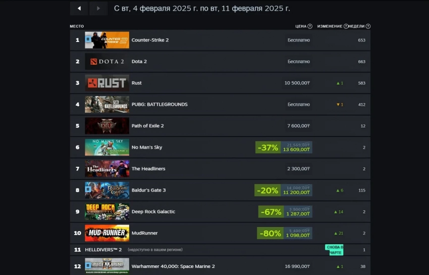 Заодно в первую десятку попали Baldur’s Gate III и Deep Rock Galactic. Неведанным образом в чарте оказалась и недоступная в России Helldivers 2 (11 место), которая обогнала Warhammer 40,000: Space Marine 2.