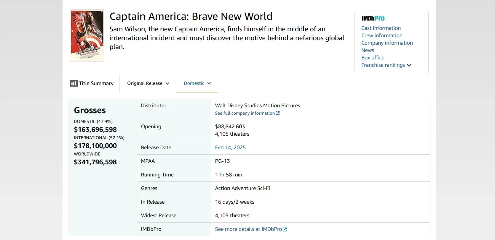 «Капитан Америка: Новый мир» — 15 млн долларов в США (341,7 млн долларов в мире);