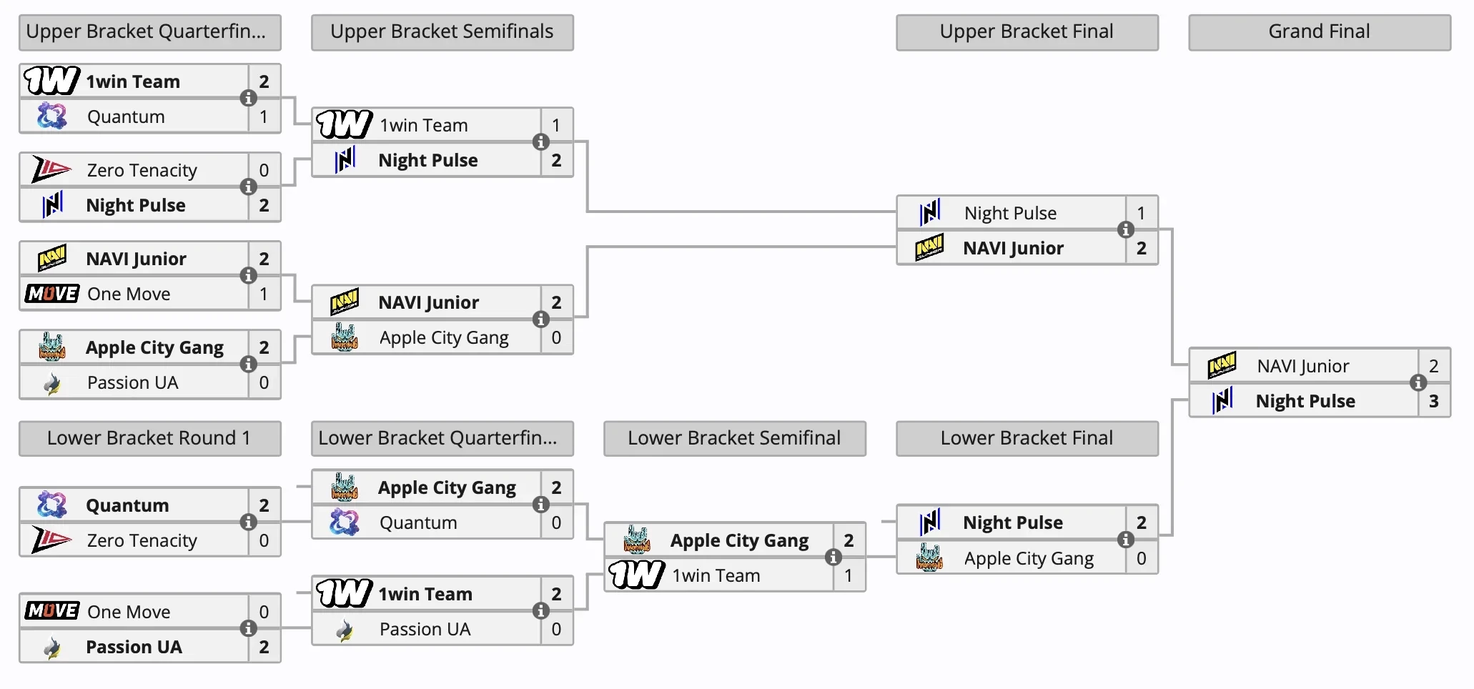 На групповом этапе Night Pulse заняла второе место в своей группе, выиграв три матча из четырех. В плей-офф коллектив продолжил победную серию, обыграв 1win Team в полуфинале верхней сетки и Zero Tenacity в четвертьфинале. При этом в финале верхней сетки NAVI Junior всё же удалось обыграть Night Pulse. После чего они взяли реванш в финале турнира.