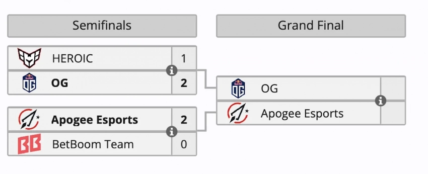 OG одержала победу над Heroic со счетом 2-1 в полуфинале квалификации. Apogee Esports уверенно обыграла BetBoom Team со счетом 2-0.