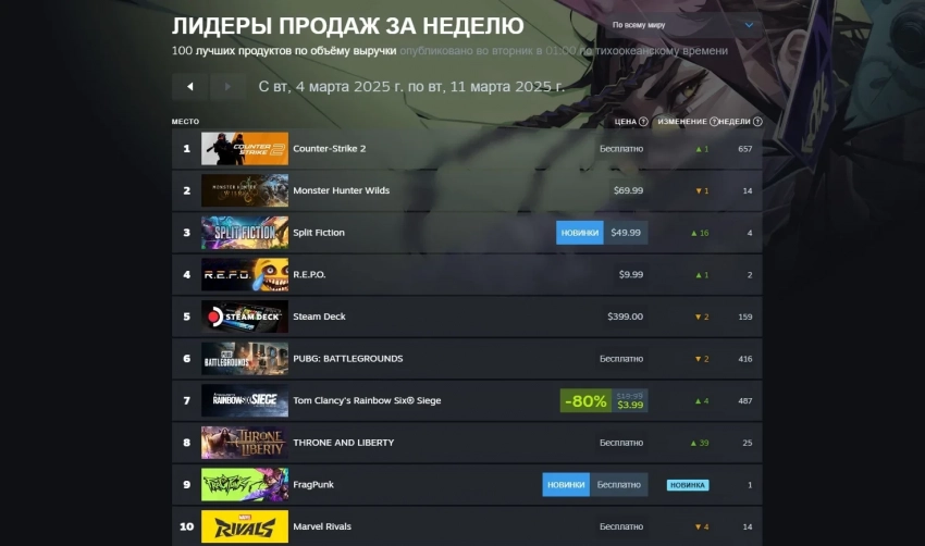 Ни Monster Hunter Wilds, ни Split Fiction, ни Steam Deck в российском Steam нет, поэтому освободившиеся места заняли другие игры.
