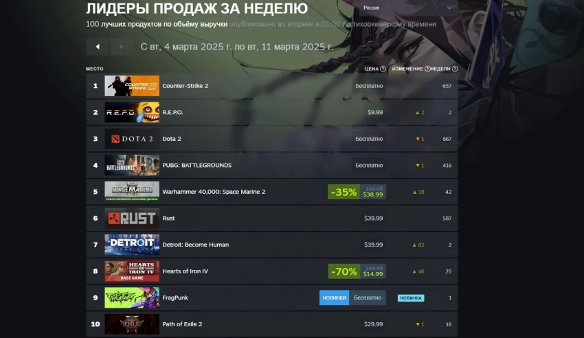 Топ-10 игр/устройств по выручке в российском Steam с 4 по 11 марта 2025 года