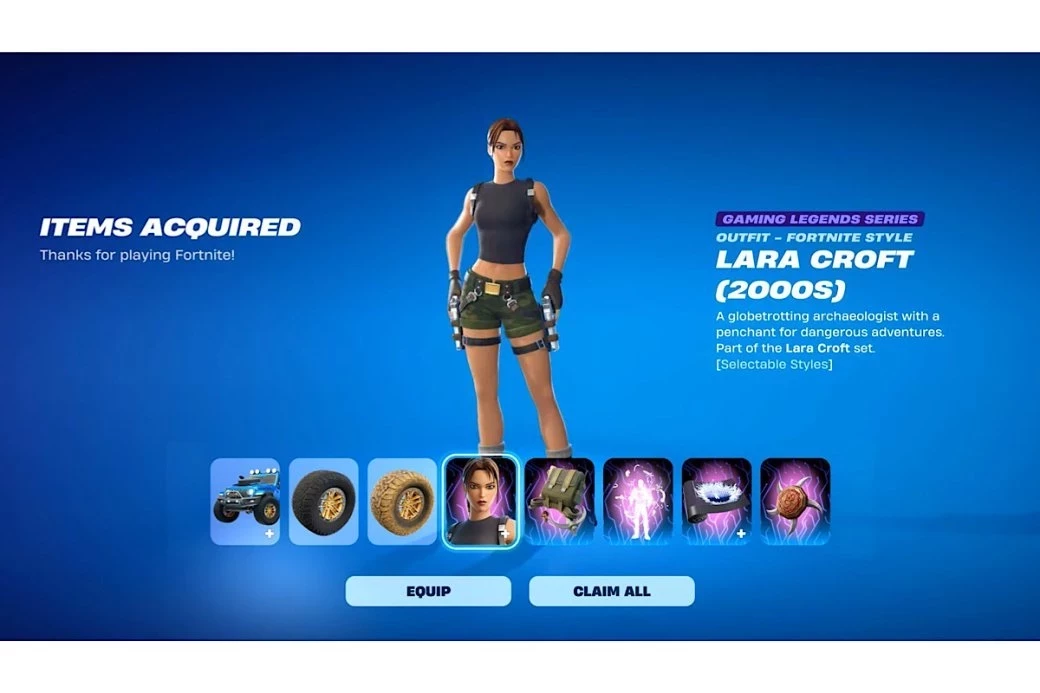 Скин доступен в магазине Fortnite с 14 марта вместе с новыми предметами из серии Tomb Raider, включая рюкзаки, эмоции и обёртки. Лара Крофт может быть приобретена как отдельно, так и в составе набора.