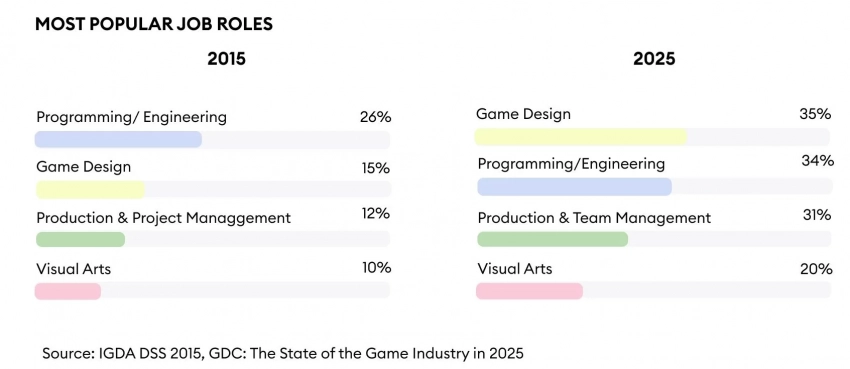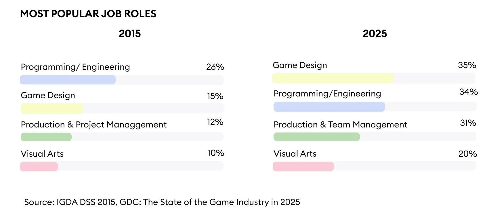- На первое место по роду работы за десять лет выбился игровой дизайн: количество специалистов выросло с 15% до 35%.