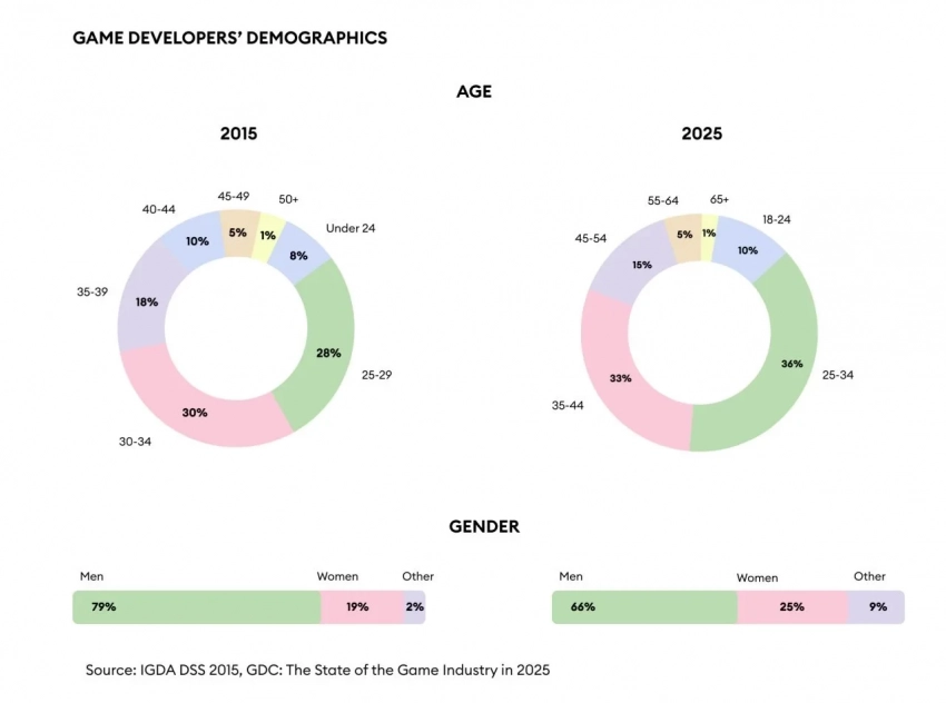 - Меняется не только средний возраст. В 2015 году женщины составляли лишь 19% от общего числа разработчиков игр, но в 2025 году этот показатель подскочил на 6%.