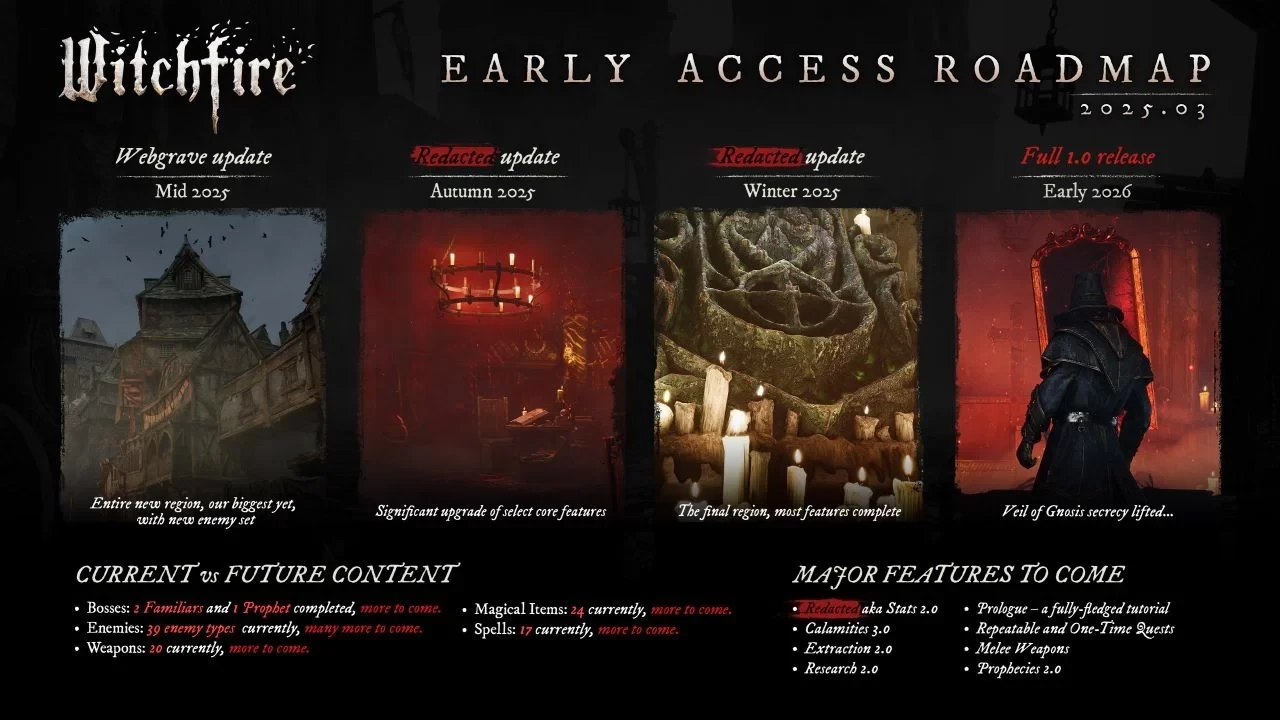 Обновлённую версию дальнейших событий студия опубликовала в Steam, напомнив, что с момента премьеры в 2023 году к Witchfire выпустили общей сложности пять крупных обновлений, 27 патчей и 6 хотфиксов. Но следующее крупное обновление Webgrave, первоначально запланированное на эту весну, теперь должно выйти в середине 2025 года. Работа над ним уже идёт.