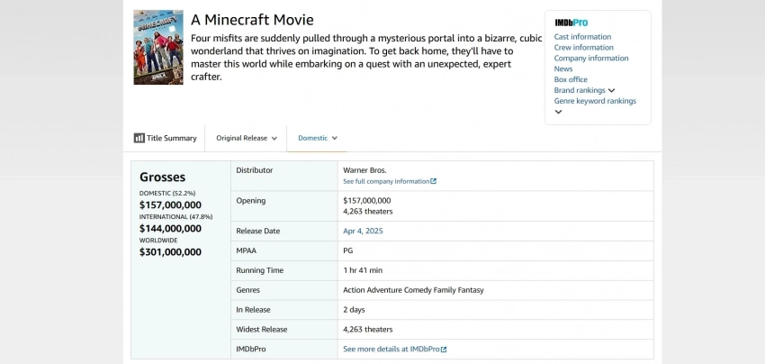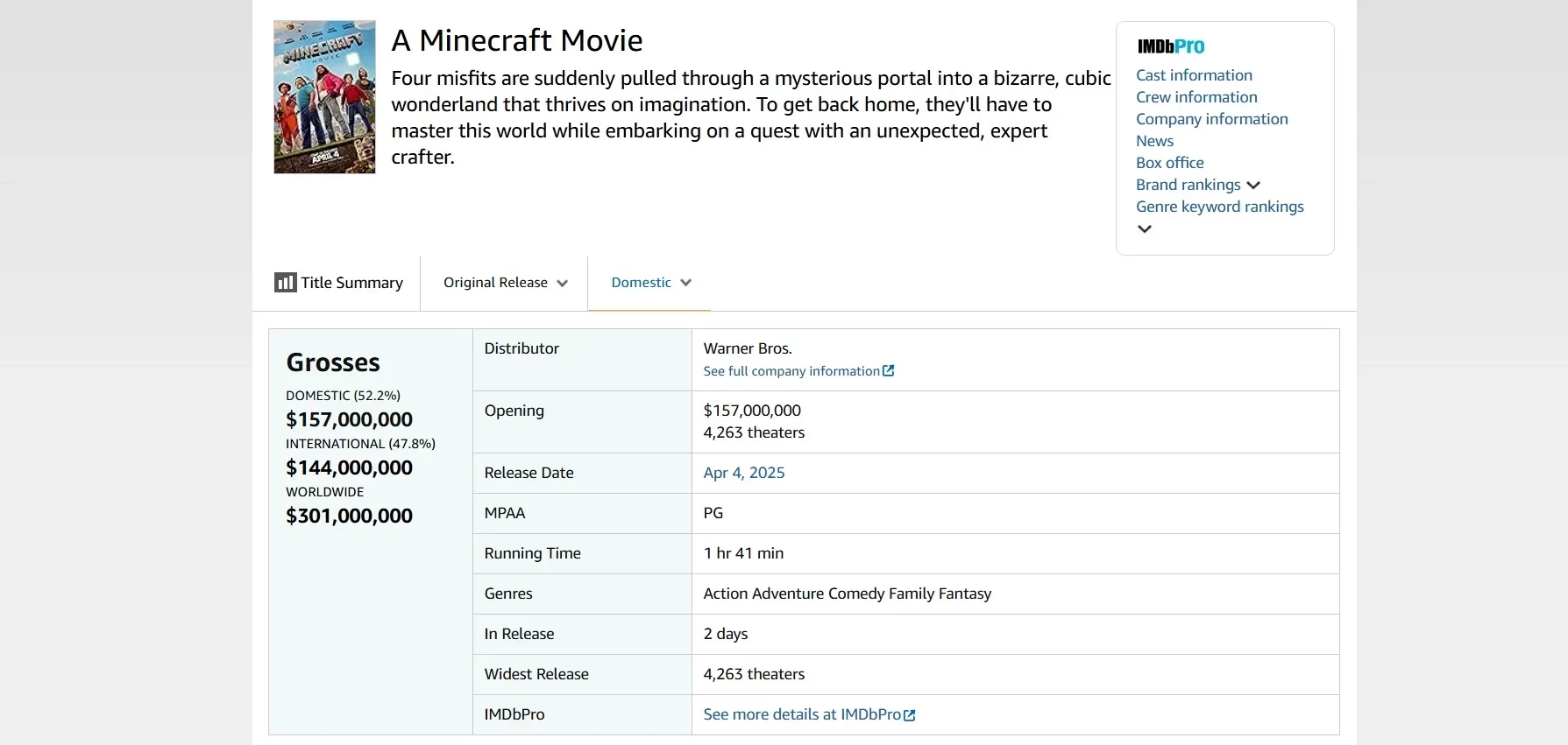 В Северной Америке «Minecraft в кино» официально показал лучший старт как в 2025 году, так и среди всех киноадаптаций видеоигр. Лента обогнала «Капитана Америку: Новый мир» с его 100 млн долларов и «Братьев Супер Марио в кино» с предыдущим рекордным результатом в 146,3 млн млн долларов соответственно.