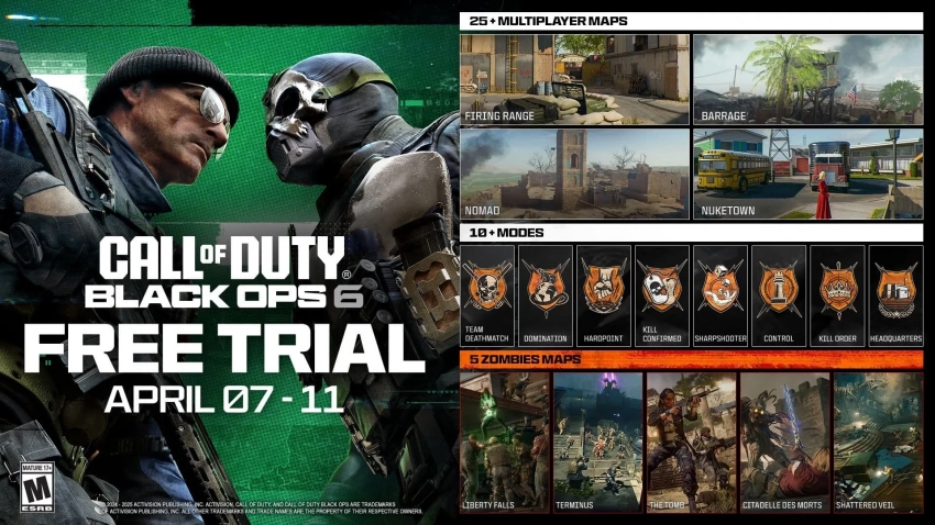 Самое интересное о кино на YouTube канале Игромании!Обложка: Call of Duty: Black Ops 6Activision объявила о начале бесплатного пробного периода для многопользовательского режима и зомби-режима Call of Duty: Black Ops 6. До 11 апреля 2025 года все игроки смогут бесплатно получить доступ ко всем картам для 6v6-сражений, включая новые карты третьего сезона, такие как Nomad, Barrage и обновленную Firing Range.