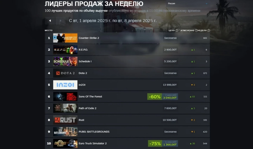 Например, вслед за шутером идёт криминальный симулятор Schedule I, который вышел в конце марта и попал в скандал — разработчиков винят в краже различных элементов и механик, из-за чего потенциально их ждёт суд. Недавней новинке удалось опередить кооперативный хоррор R.E.P.O., а также портативный компьютер Steam Deck.