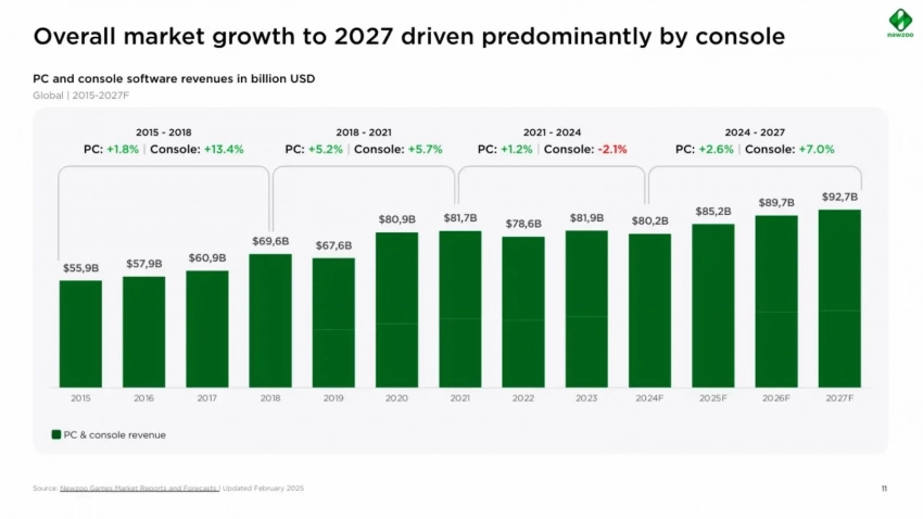 - По оценкам аналитиков, с 2024 по 2027 год рынок PC вырастет на 2,6%, а консольный рынок ждёт подъём на 7%.