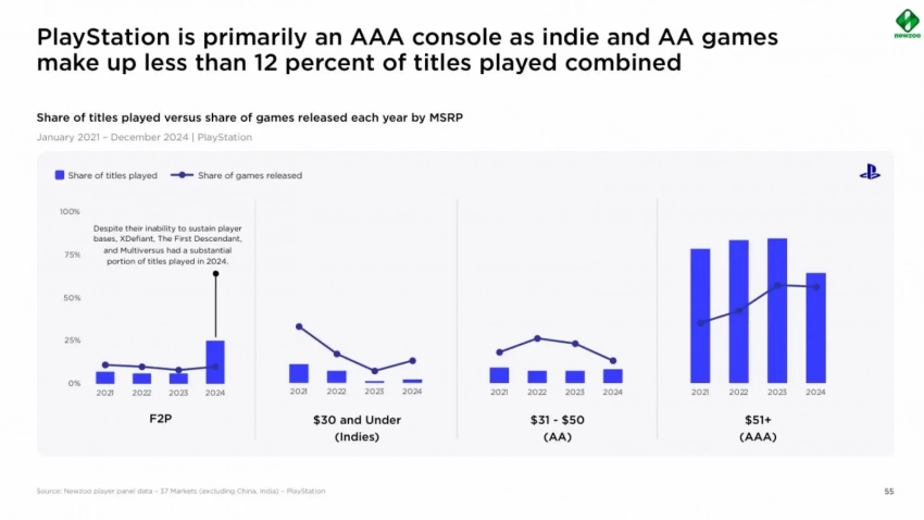 - На PlayStation доминируют крупные высокобюджетные релизы, а низкобюджетные и инди-игры занимают менее 12%.