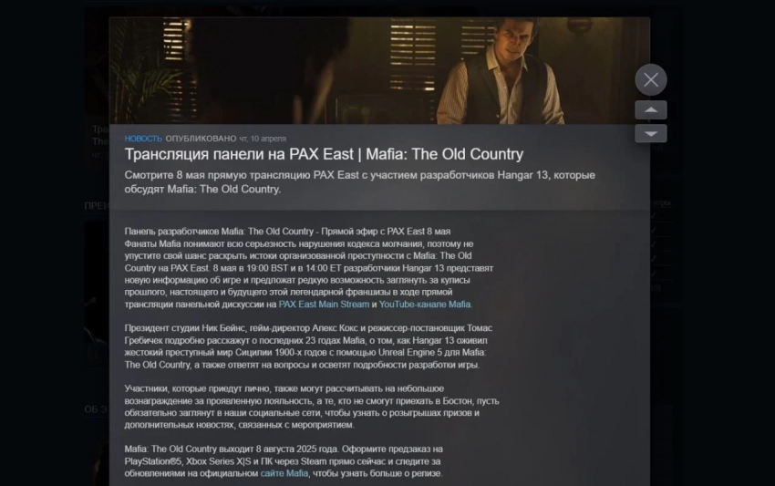 «Президент студии Ник Бейнс, гейм-директор Алекс Кокс и режиссер-постановщик Томас Гребичек подробно расскажут о последних 23 годах Mafia, о том, как Hangar 13 оживил жестокий преступный мир Сицилии 1900-х годов с помощью Unreal Engine 5 для Mafia: The Old Country, а также ответят на вопросы и осветят подробности разработки игры».