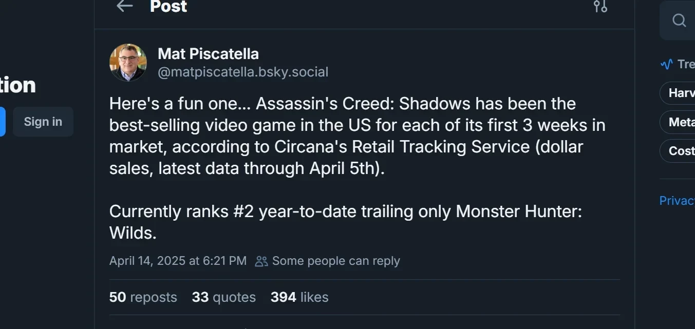 Assassinʼs Creed Shadows захватила чарты США, но уступила одной игре