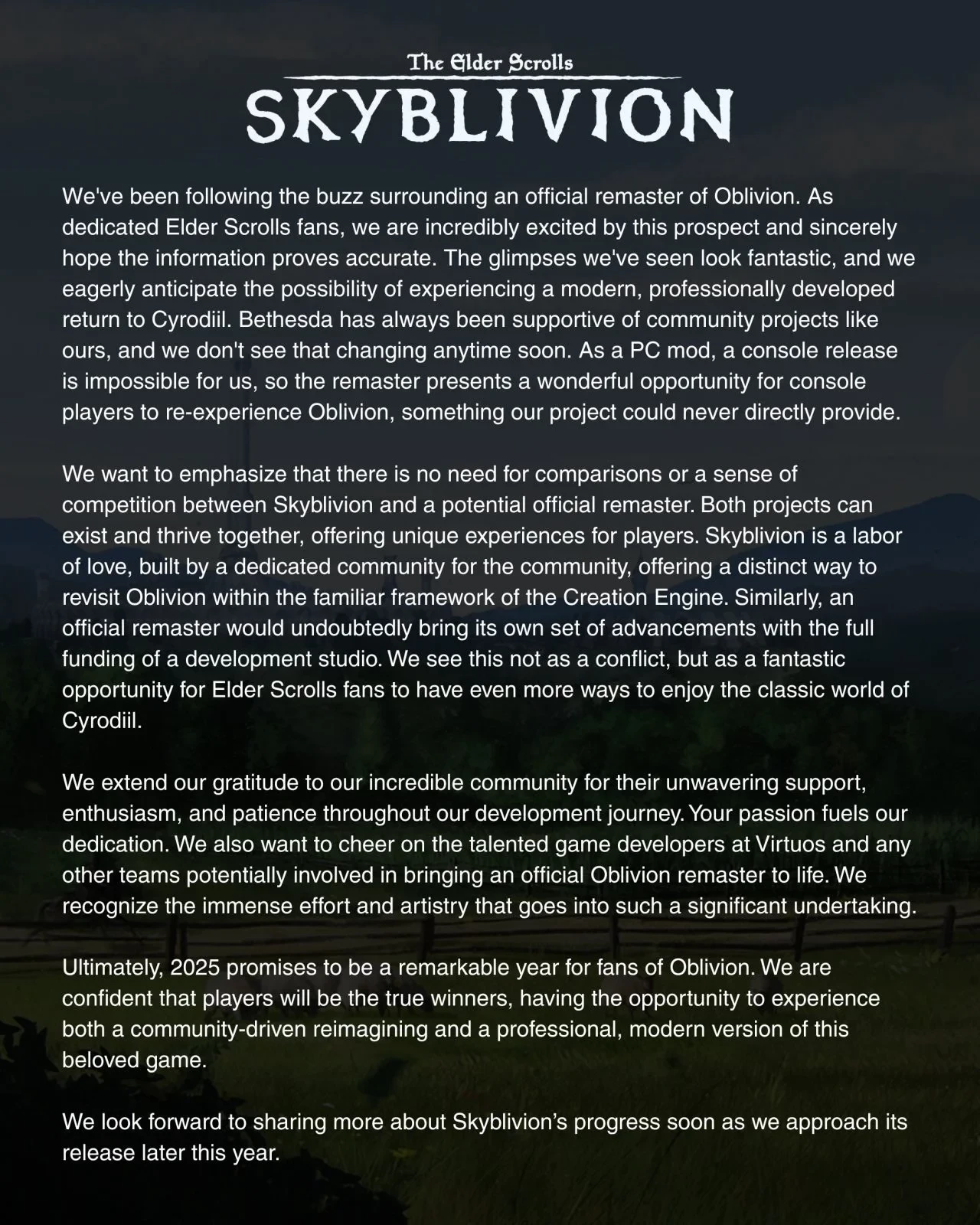Оба проекта могут жить и существовать вместе, давая игрокам разные впечатления. Skyblivion — проект любви, создаваемый преданным сообществом для сообщества. Позволяющий знакомиться с игрой на знакомом движке Creation. В то же время официальный ремастер наверняка готовит нам массу улучшений благодаря финансированию студии. Мы видим не конфликт, а уникальную возможность для поклонников Elder Scrolls — насладиться классическим миром Сиродила разными способами.