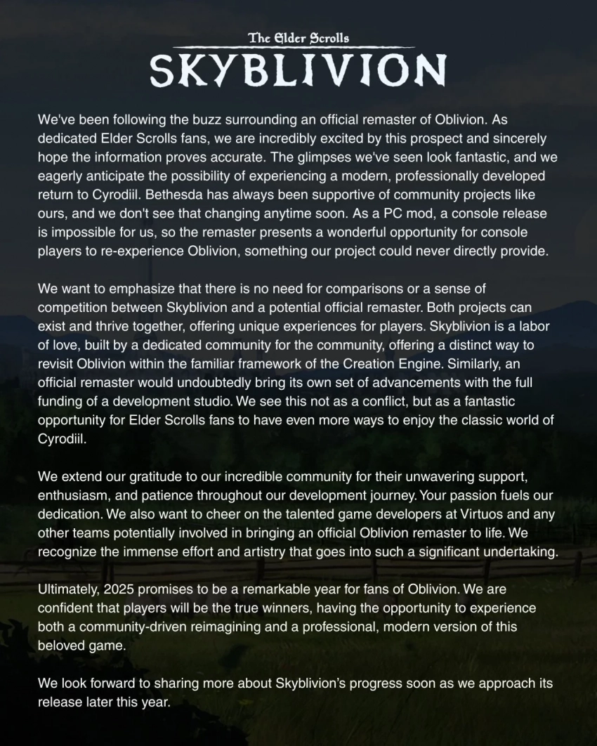 Самое интересное о кино на YouTube канале Игромании!Арт OblivionРазработчики масштабной модификации Skyblivion на днях отреагировали на вести о ремастере The Elder Scrolls 4: Oblivion со сдержанным оптимизмом. Однако пару дней спустя их настроение изменилось: в новом сообщении выход сразу двух версий обновлённой Oblivion они назвали настоящей победой для игроков.