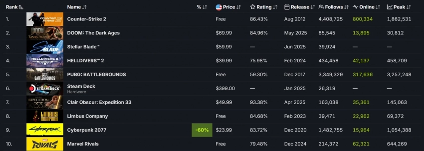 Самое интересное о кино на YouTube канале Игромании!Обложка: скриншот Stellar BladeКак только у Stellar Blade открылись предзаказы, так игра стремительно влетела в текущие лидеры продаж в Steam. В момент написания новости экшен находится на третьей строчке, уступая лишь условно-бесплатной Counter-Strike 2 (там в продажах учитываются микротранзакции) и свежей DOOM: The Dark Ages.