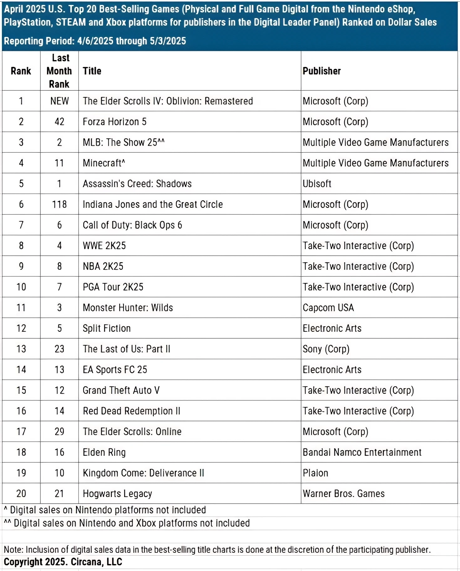 Самое интересное о кино на YouTube канале Игромании!Обложка: The Elder Scrolls IV: Oblivion RemasteredАналитик Мэт Пискателла из Circana рассказал о самых продаваемых видеоиграх в США в апреле 2025 года. Учитывались доходы с продаж игр как в рознице, так и в цифре.