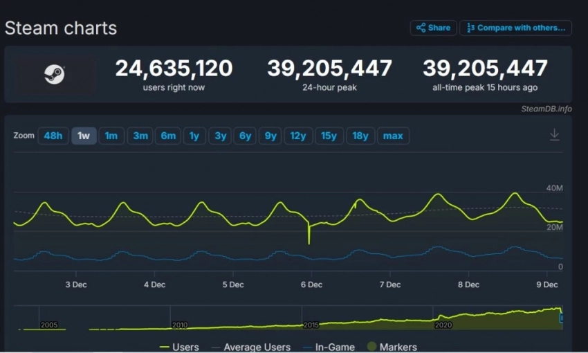 Это новый рекорд платформы. Предыдущий был зафиксирован в сентябре этого года — тогда онлайн Steam составил 38 367 277 человек.