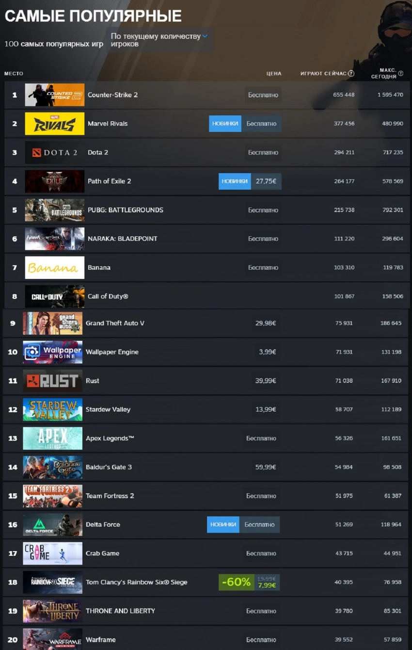 Главные новости » Эксклюзив » В Steam новый рекорд онлайна на фоне релизов Path of Exile 2, Marvel Rivals и Delta Force