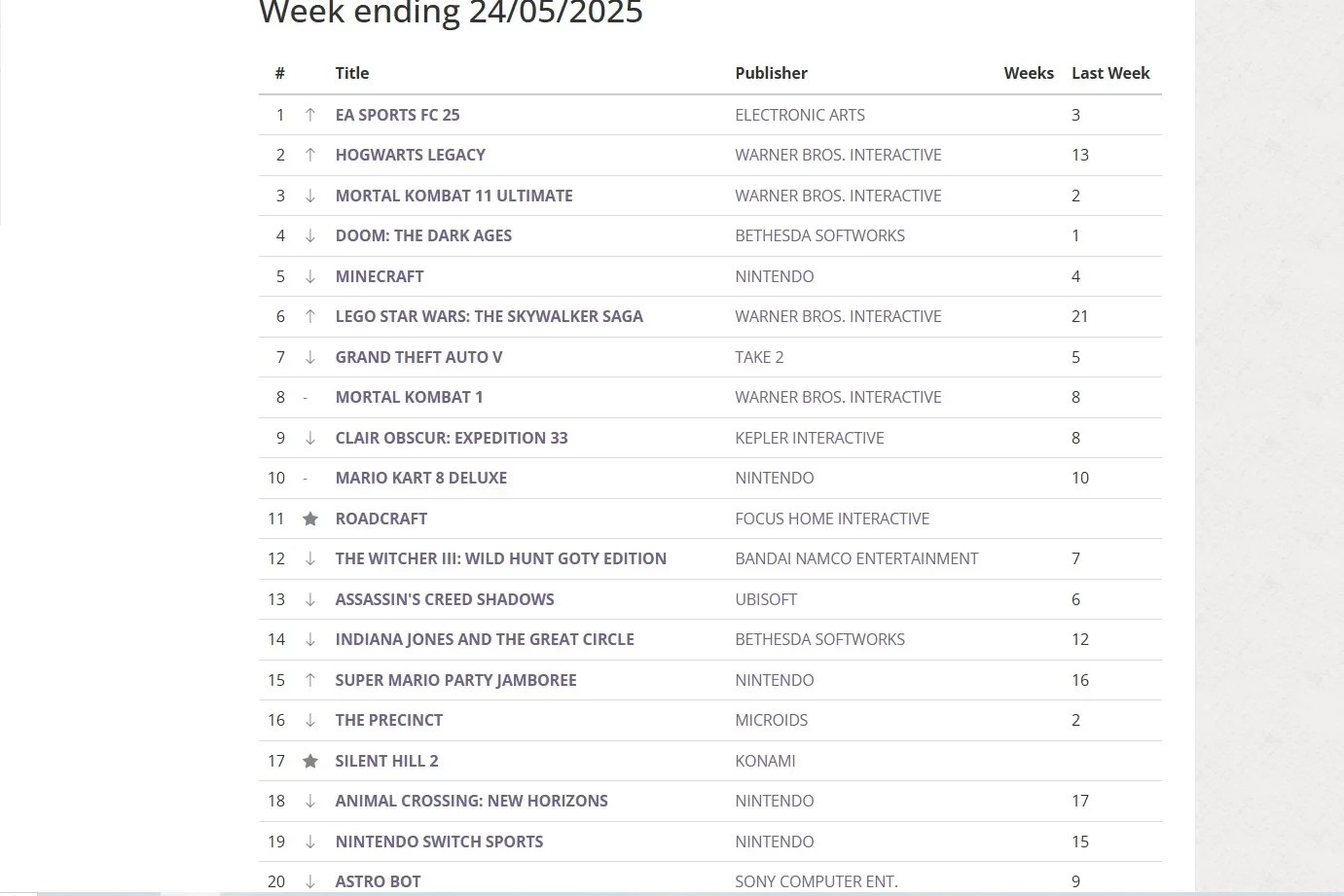 Лидирующую позицию заняла EA Sports FC 25, поднявшаяся с 3-й строчки. На второй строчке оказалась Hogwarts Legacy, которая вновь ворвалась в топ-10 после 13-й позиции на позапрошлой неделе. Закрывает топ-3 файтинг Mortal Kombat 11 Ultimate.
