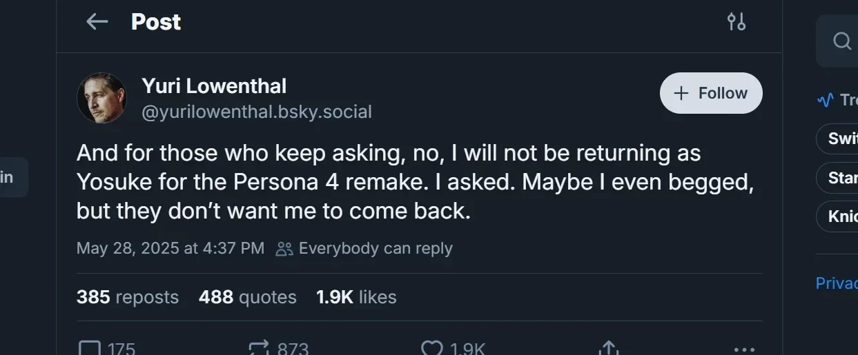 «Для всех, кто продолжает спрашивать: нет, я не вернусь к роли Ёске в ремейке Persona 4. Я просил об этом. Возможно, я даже умолял, но они не хотят моего возвращения», — написал Ловенталь.