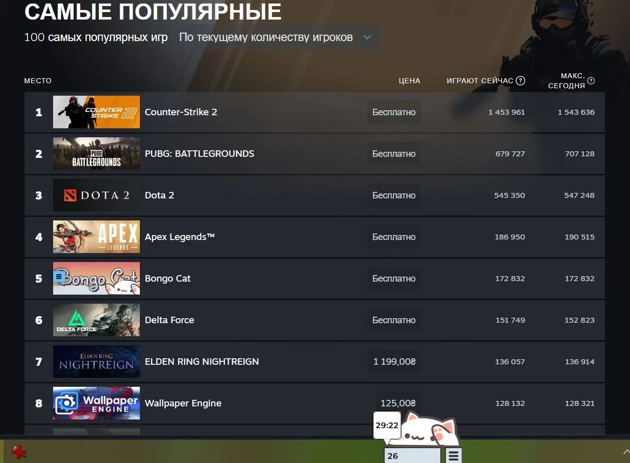 Ещё больше интересных видео на YouTube канале Игромании!Bongo Cat мемМилый бесплатный кликер Bongo Cat, релиз которого состоялся в марте, держится на верхних позициях самых популярных игр в Steam. Сейчас игра обосновалась на пятом месте, обойдя Elden Ring Nightreign и Grand Theft Auto V Legacy, но не так давно поднималась до четвёртого. По данным SteamDB, её максимальный онлайн составил 194 508 игроков.