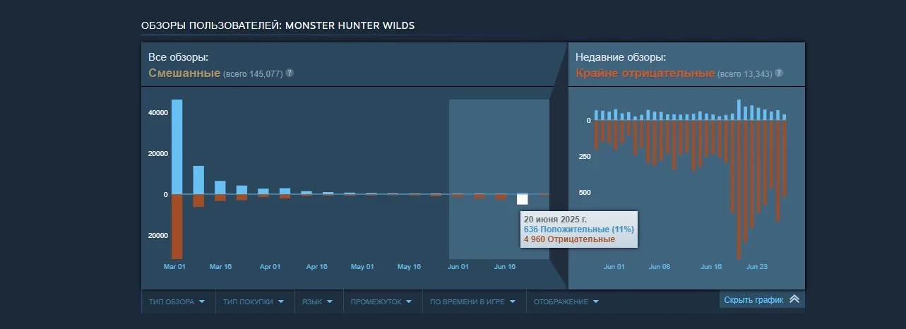 Ещё больше интересных видео на YouTube канале Игромании!Обложка: скриншот Monster Hunter WildsВсего несколько дней остаётся до выхода второго крупного обновления Monster Hunter Wilds, но не факт, что поклонники встретят его позитивно — всё дело в технических проблемах. Именно из-за них недавние обзоры игры в Steam (за последние 30 дней) стали «крайне отрицательными», а масла в огонь подливает и уже готовый список изменений грядущего патча.