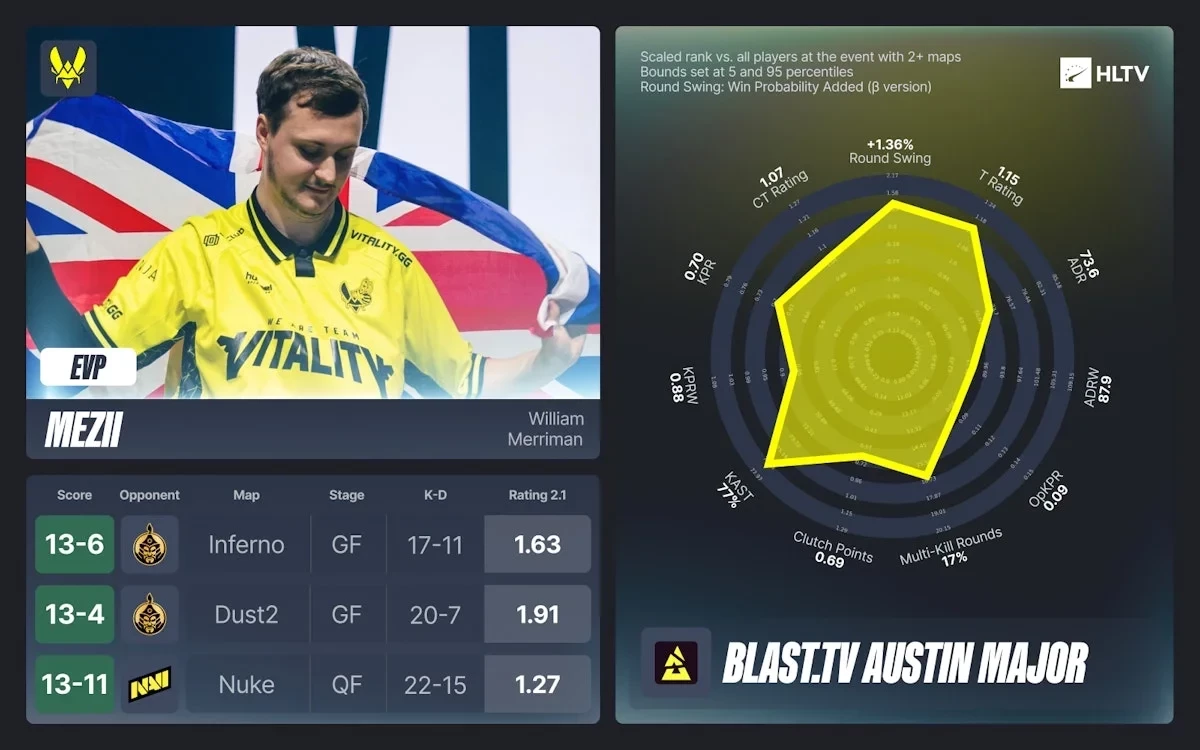 Уильям «⁠mezii⁠» Мерриман из Великобритании, получивший похвалу от apEX, также завоевал свой первый EVP в этом году. Его выдающаяся игра в гранд-финале помогла Vitality выйти из сложной ситуации и одержать победу.