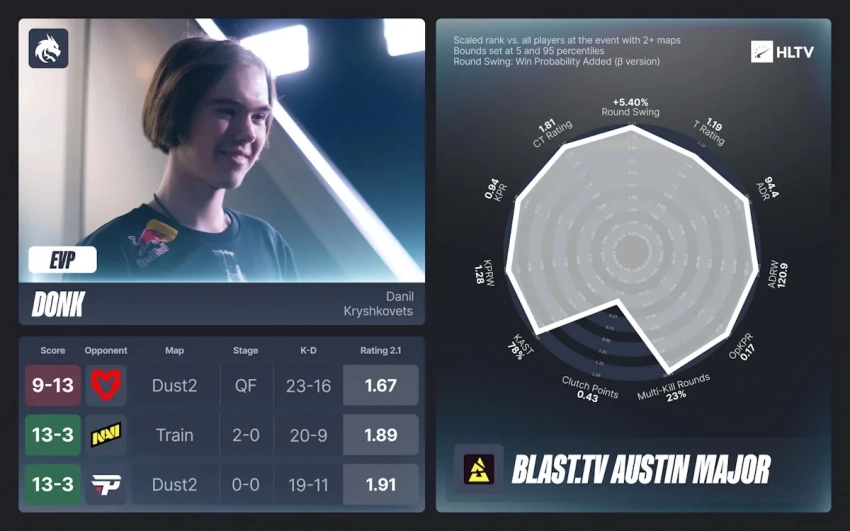 Данил «⁠donk⁠» Крышковец из России, несмотря на выход лишь в четвертьфинал, заслужил звание сильнейшего EVP благодаря своим впечатляющим статистическим показателям. Его игра за команду Team Spirit была ярким примером мастерства и таланта.