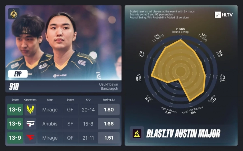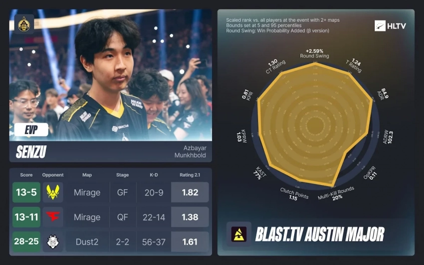 Азбайар «⁠Senzu⁠» Мунхболд из Монголии помог своей команде The MongolZ сделать огромный шаг, проявив себя как зрелый и уверенный игрок. Его рекордные 56 убийств на Dust2 останутся в памяти болельщиков как одно из самых ярких событий турнира.