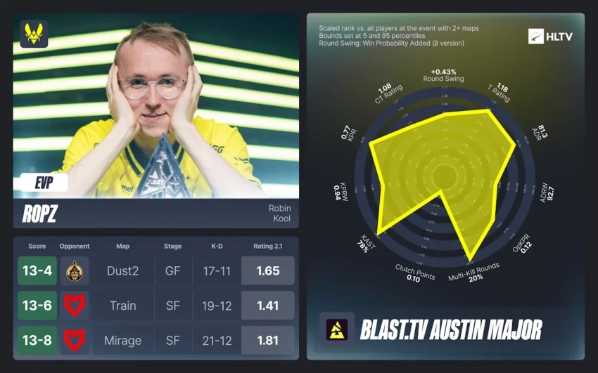 Робин «⁠ropz⁠» Кул из Эстонии получил признание за вклад в успех своей команды Vitality, став двукратным чемпионом мажора. Его игра в полуфинале против бывшего клуба MOUZ стала одной из самых запоминающихся на турнире.