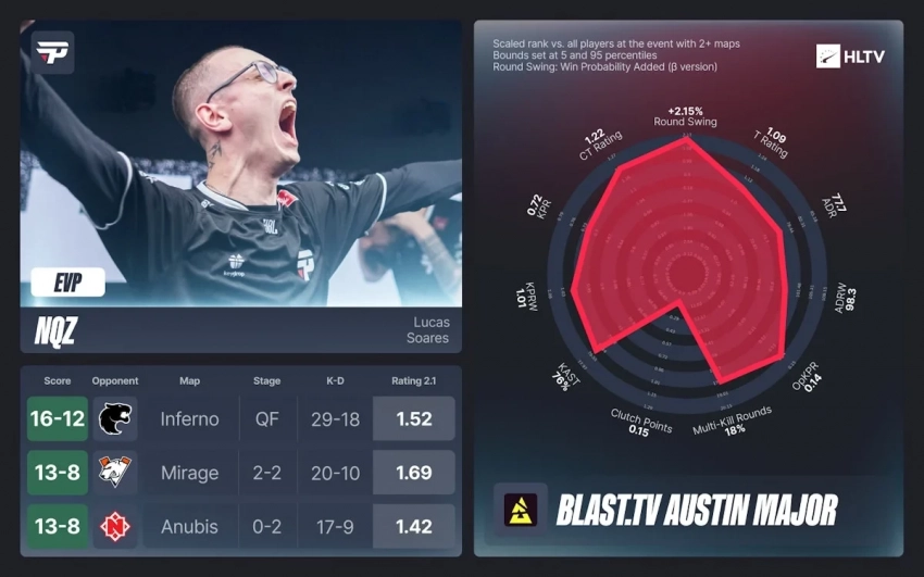 Лукас «⁠nqz⁠» Соарес из Бразилии завершает этот звездный список, заслужив свой EVP благодаря невероятным показателям в победах paiN.