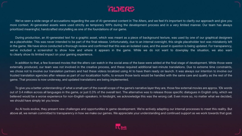 Подтвердили разработчики и версию об использовании нейросетей для локализаций. Это решение объяснили недостатком времени: несколько роликов были добавлены в The Alters на финальном этапе разработки, и их перевод решили доверить ИИ, чтобы не провоцировать задержки. Студия заявила, что это относилось к 0,3% всех текстов: около 10 тысяч слов из 3,4 миллиона.