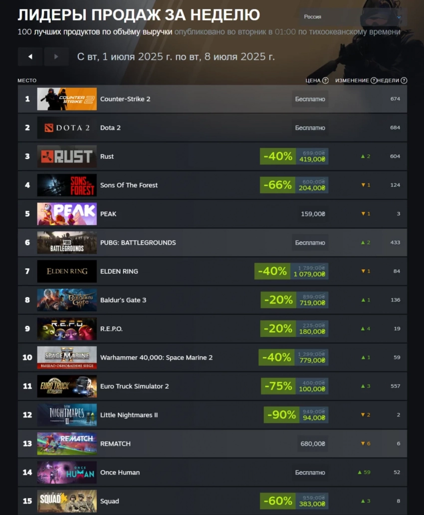 В российском чарте кооператив Peak тоже занимает одно из высоких мест, но его обходит хоррор-выживалка Sons of the Forest. В числе популярных также задержались футбольный симулятор Rematch, который довольно быстро покинул мировой чарт, и ещё один кооператив — R.E.P.O.