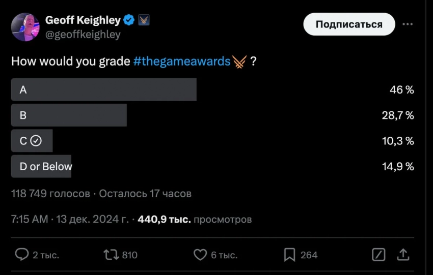 Ровно 46% игроков посчитали, что церемонии можно поставить «5 баллов» (оценка «A»). Пользователи оценили представленные анонсы, победителей разных категорий и другие моменты мероприятия.