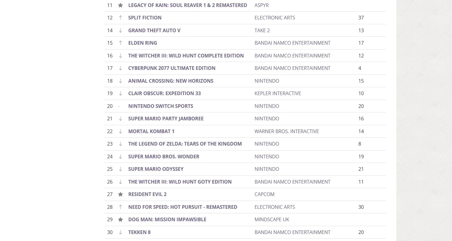 Ещё один впечатляющий взлёт продемонстрировало кооперативное приключение Split Fiction. Так, на позапрошлой неделе оно располагалось на 37-й строчке, а теперь оно на 12-й.