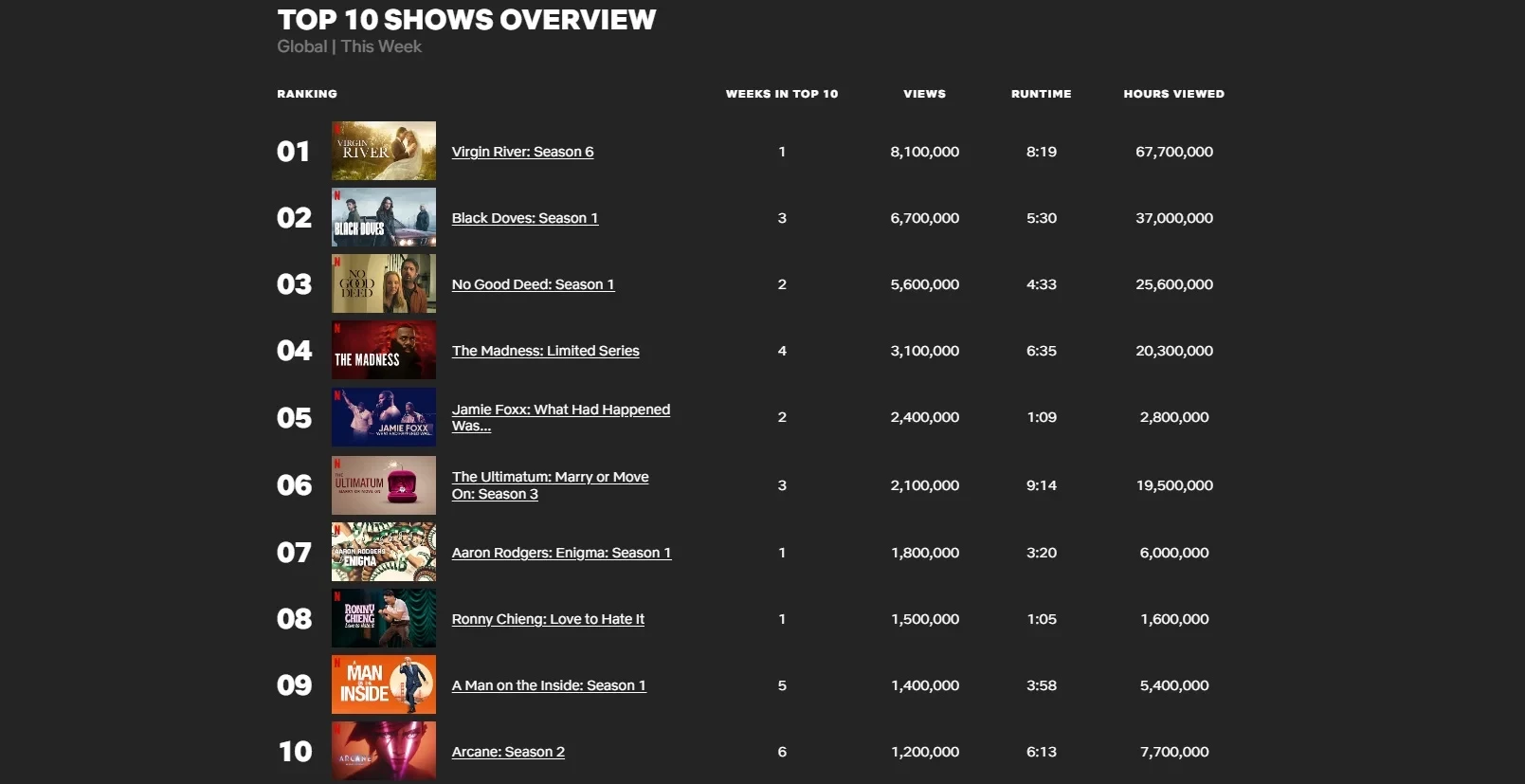 А вот второй сезон «Аркейна» опустился на десятую строчку — за прошедшую неделю он набрал 1,2 млн просмотров.