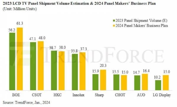 Производители телевизионных ЖК-панелей поставили перед собой задачу продать в 2024 году около 251 млн единиц продукции, но аналитики считают, что реализовать получится около 242 млн панелей, что соответствует годовому росту на 3,4 %. При этом выраженные в единицах площади поставки вырастут по сравнению с 2023 годом на 8,6 % из-за растущей тенденции к увеличению размеров продукции.