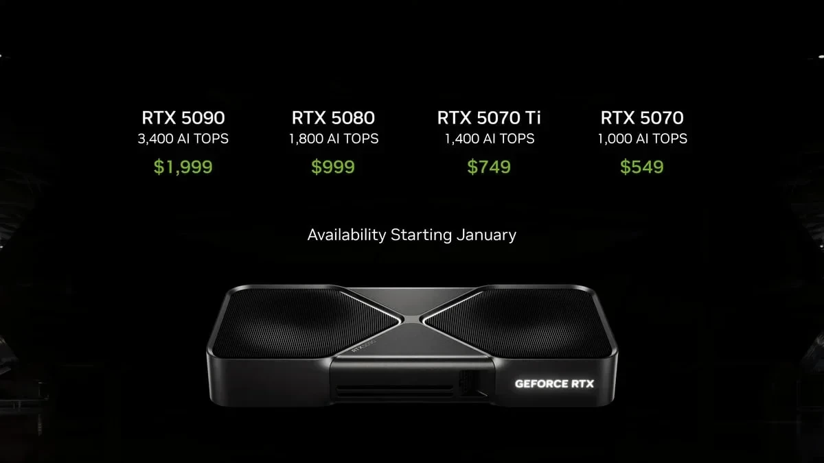 Речь идёт о моделях RTX 5090, RTX 5080, RTX 5070 Ti и RTX 5070 — стоимость варьируется от 549 долларов до 1999 долларов.