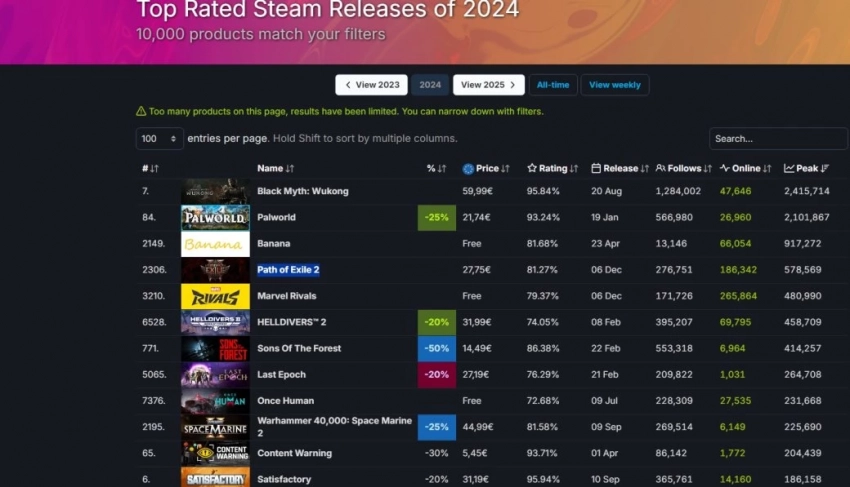 Напомним, что в 2024 году в Steam вышли в числе прочего Helldivers 2, Palworld, Banana, Path of Exile 2 и Black Myth: Wukong, которые собрали вокруг себя большие аудитории.